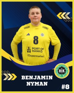 8 Benjamin Nyman 2. Allan Westerholm3. Adrian Nyman4. Rasmus Holmberg6. Jimmy Sinkko7. Elias Sandell8. Benjamin Nyman11. Alex Vahtera13. Nina Laxell14. Xander Wikman15. Adele Rosendahl19. Melwin Himberg23. Iivari Kiljunen29. Arthur Österlund33. Paul Böckerman35. Alec Grundström36. Smilla Cehlin37. Amanda Ekqvist Nuvarande lagHC Hik