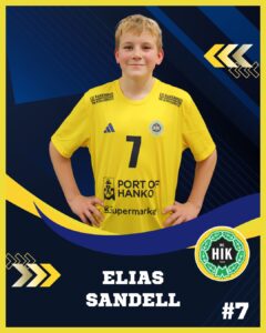 7 Elias Sandell 2. Allan Westerholm3. Adrian Nyman4. Rasmus Holmberg6. Jimmy Sinkko7. Elias Sandell8. Benjamin Nyman11. Alex Vahtera13. Nina Laxell14. Xander Wikman15. Adele Rosendahl19. Melwin Himberg23. Iivari Kiljunen29. Arthur Österlund33. Paul Böckerman35. Alec Grundström36. Smilla Cehlin37. Amanda Ekqvist Nuvarande lagHC Hik