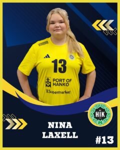 13 Nina Laxell 2. Allan Westerholm3. Adrian Nyman4. Rasmus Holmberg6. Jimmy Sinkko7. Elias Sandell8. Benjamin Nyman11. Alex Vahtera13. Nina Laxell14. Xander Wikman15. Adele Rosendahl19. Melwin Himberg23. Iivari Kiljunen29. Arthur Österlund33. Paul Böckerman35. Alec Grundström36. Smilla Cehlin37. Amanda Ekqvist Nuvarande lagHC Hik